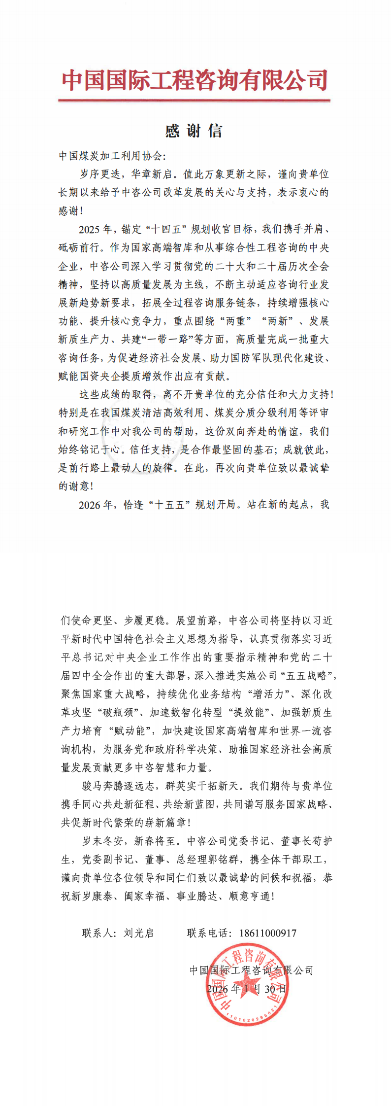 中国国际工程咨询有限公司向中国煤炭加工利用协会发来感谢信