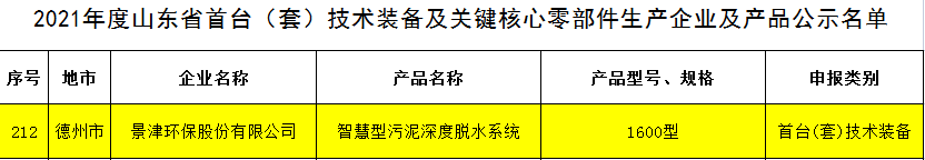 中国煤炭加工利用协会会员单位景津环保股份有限公司产品入选2021年度山东省首台(套)技术装备及关键核心零部件生产企业及产品名单.