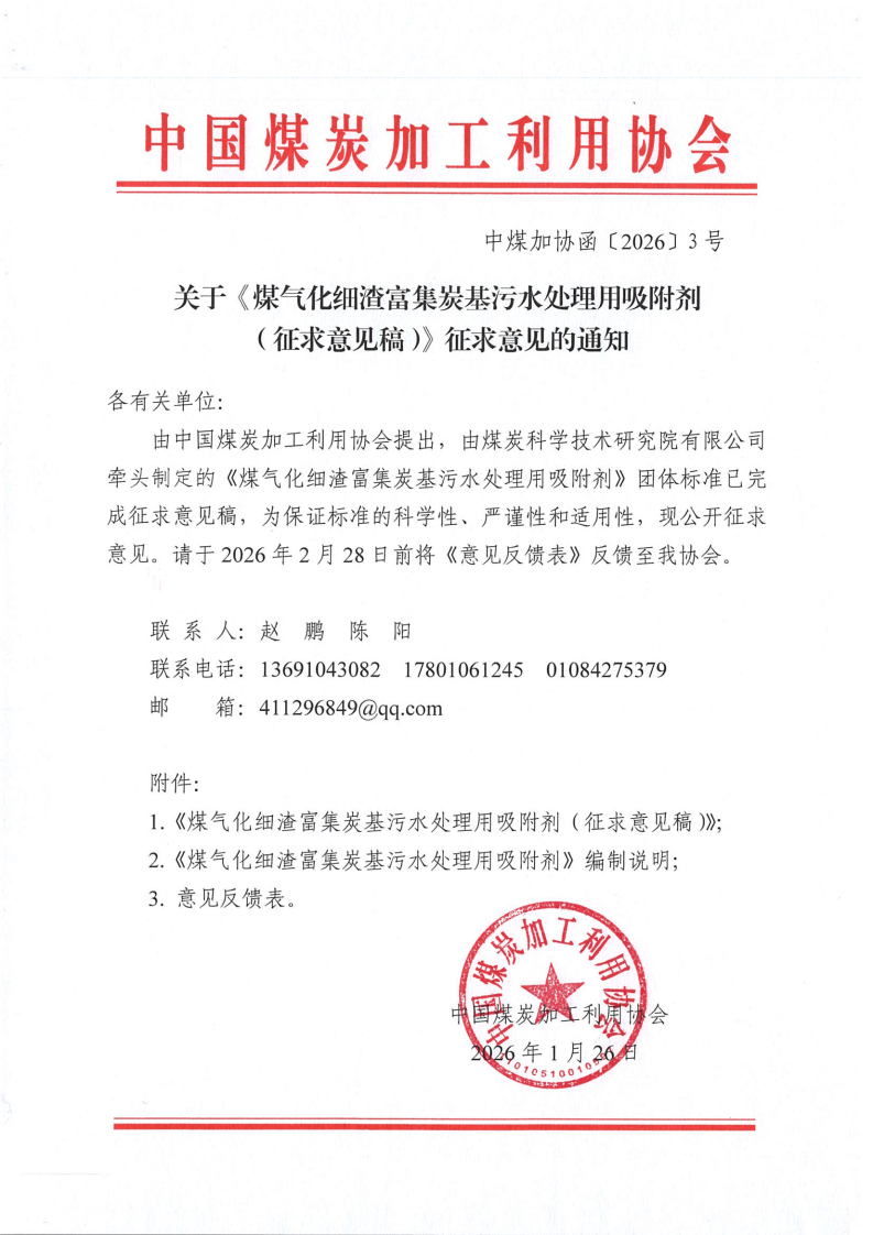 关于《煤气化细渣富集炭基污水处理用吸附剂(征求意见稿》征求意见的通知